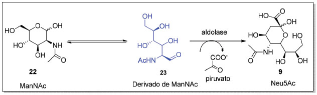 Uma abordagem mais comum para a síntese enzimática de Neu5Ac envolve a preparaçao química da N-acetilmanosamina modificada (ManNAc), derivados 23, e a sua conversao no correspondente derivado Neu5Ac utilizando a enzima Neu5Ac aldolase conforme representado no Esquema 4. Convém destacar que a enzima Neu5Ac aldolase catalisa a clivagem reversível do Neu5Ac em piruvato e ManNAc.54