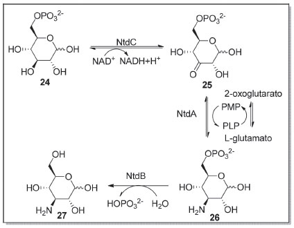 ![]() Esquema 4. Via biossintética de kanosamina em Bacillus subtilis