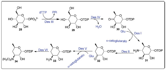 Esquema 5. Via biossintética de seis etapas envolvendo aminaçao de TDP-3-oxo-6-desoxi-D-glicose por DesV aminotransferase
