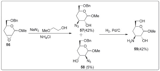 Síntese de aminoaçúcares a partir de epóxi-açúcares Em 1993, Roger e colaboradores78 descreveram a síntese do 3-Amino-3,4-dideoxi-β-D-xilo-hexapiranosideode metila 59 com azida de sódio (Esquema 7). Nessa reaçao houve a formaçao de dois intermediários 57 e 58, os quais foram obtidos na proporçao de 3:2. Esta mesma reaçao de síntese a partir do epóxido 56 também foi mencionado por Ferrier e Collins.79