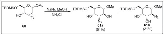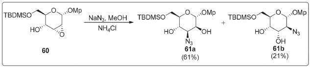 Okazaki e colaboradores80 propuseram a síntese de dois intermediários contendo anéis de três membros, o epóxido 60, e em seguida o isômero syn-60 foi subsequentemente aberto usando azida de sódio (Esquema 8) para dar a mistura dos regioisômeros 61ab (74:28).