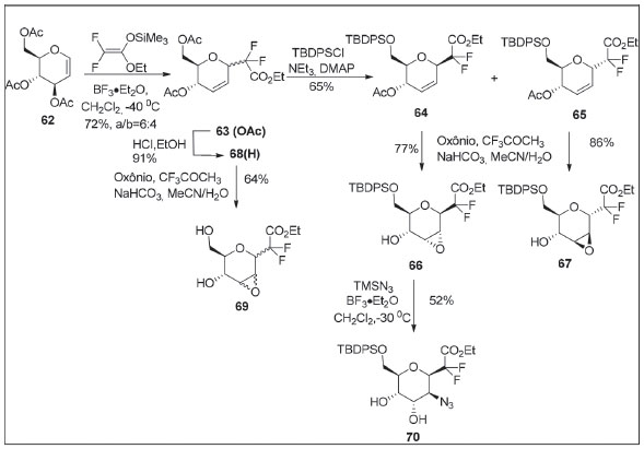 Em 2009, Poulain e colaboradores81 relataram a reaçao de um difluoroceteno acetal sililado ao D-glical 62 para produzir o C-glicosídeo 2,3-insaturado 63, o qual foi submetido a uma reaçao de desproteçao para fornecer 68 e uma reaçao de proteçao para fornecer os α,β-anômeros 64 e 65. Segundo os autores, a partir das reaçoes de desproteçao/proteçao, duas sequências de reaçoes foram planejadas para obtençao de aminoacúcares: a) reaçao epoxidaçao da ligaçao dupla de 64, 65 e 68 e b) reaçao de abertura de anel dos epóxidos com nucleófilos de nitrogênio (TMSN3) para fornecer o composto 70 em rendimento de 52% (Esquema 9).82