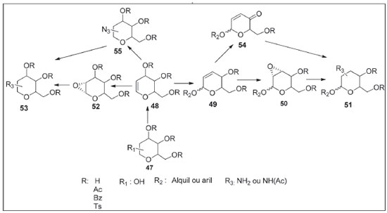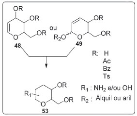 SINTESE DE AMINOAÇUCARES Alguns métodos relatados para síntese de aminoaçúcares envolvem as ligaçoes dupla dos glicais 48, obtidos a partir do composto 47, e dos hexenopiranosídeos 49 (Esquema 6), que representam excelentes materiais de partida devido ao seu baixo custo e disponibilidade comercial.71 Sua obtençao se dá após abertura de derivados epoxi-açúcares por aminas,8 reduçao de derivados de oxima e azida,72 reaçao de adiçao a ligaçoes duplas de glicais73-75 e de glicosídeos 2,3-insaturados76 e cicloadiçao à cetoaçúcares, dentre outros.77