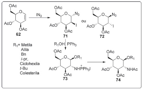![]() Esquema 11. Síntese de aminoaçúcares a partir tri-O-acetil-D-glical e iodoazida