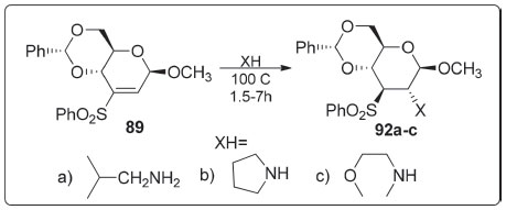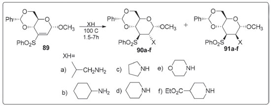 Por outro lado, os mesmos autores propuseram uma rota sintética onde o composto metil 2,3-didesoxi-4,6-O-(fenilmetileno)-3-C-fenil-sufonil-β-D-eritro-hex-2-enopiranosídeo 89 reagiu com várias aminas através de uma reaçao de Michael, Esquema 16. A rota de síntese de vários aminoaçúcares com configuraçao glico a partir de 89 constitui um novo método para introduçao de amina N-monoalquiladas e N,N-dialquiladas ao carbono C-2 do anel piranosídico em configuraçao equatorial.