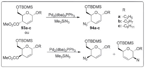 Outra metodologia descrita na literatura98,99 consistiu no uso do catalisador paládio. Nessa metodologia foram utilizados nucleófilos contendo nitrogênio para incorporar a funçao azido em C-4 e C-2 em 2,3-didesoxihex-2-enopiranosídeos para obtençao dos aminoaçúcares 94a-c, 96a-c e 97a-c (Esquema 17).
