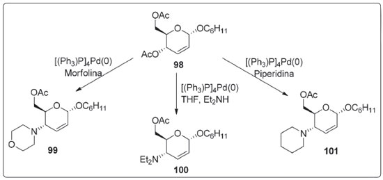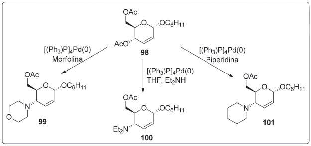 Há mais de 30 anos, Hanna e Baer100 propuseram a reaçao de aminaçao alilica, a qual consistia na síntese de aminoaçúcares insaturados a partir da transformaçao de anéis de piranoses insaturados na presença do catalisador paládio. Por outro lado, Brito e colaboradores101 utilizando o método descrito por Baer e Hanna desenvolveram a síntese de três novos 4-aminoaçúcares 2,3-insaturados 99-101 com rendimentos de 58-80% (Esquema 18) partindo de 4,6-di-O-acetil-2,3-didesoxi-α-D-eritro-hex-2-enopiranosídeo 98 e um catalisador de paládio zero. Posteriormente foi relatada a utilizaçao de nucleófilos de nitrogênio envolvendo o uso de catalisadores de paládio e algumas fontes de amina.