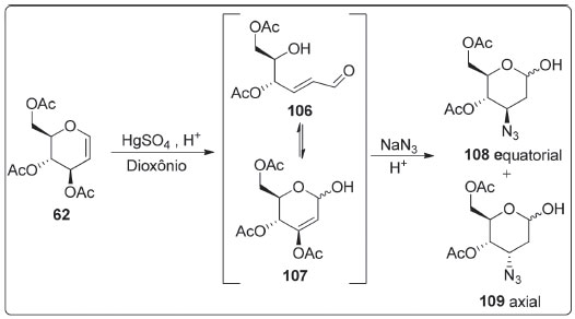 Em 2002, Liberek et al.104 descreveram a síntese de 3-aminoaçúcares através da reaçao de adiçao de Michael a aldeídos insaturados derivados de tri-O-acetil-D-glical e tri-O-acetil-D-galactal, utilizando mercúrio (Hg2+) em dioxano, seguido da adiçao de azida de sódio e ácido acético levando a formaçao de 3-azido-2,3-dideoxiaçúcares na forma de diastereisômeros (Esquema 20). Os compostos obtidos foram submetidos à uma separaçao cromatográfica, uma vez que houve a formaçao da mistura de quatro diastereoisômeros, com o grupo azido preferencialmente na posiçao equatorial (eq / ax = 2,5:1). Após separados, os distereoisômeros 123 e 124 foram submetidos a uma reaçao de hidrogenaçao e acetilaçao resultando na porçao acetilamino na posiçao C-3. Convém destacar que foi observada uma boa estereosseletividade na adiçao ao tri-O-acetil-D-glical e que a mesma foi perdida com a adiçao ao tri-O-acetil-D-galactal, isso provavelmente como consequência de impedimento estérico pelo grupo 4-acetoxi.105,106