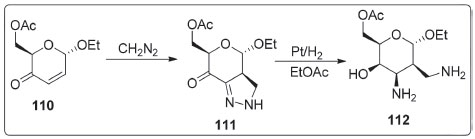 Síntese de aminoaçúcares de cadeia ramificada a partir de cetoaçúcares Açúcares de cadeias ramificadas107,108 e contendo nitrogênio ocorrem frequentemente como componentes de substâncias farmacologicamente ativas, muitos antibióticos pertencem a essa classe de compostos.109 Os cetoaçúcares α,β-insaturados sao excelentes materiais de partida para a síntese de aminoaçúcares.110 Em 1982, Holder111 fez uma revisao destas hexenopiranosiduloses. O primeiro exemplo de funcionalizaçao de piranosídeo de alquila com cromóforo ceto α,β- insaturado foi realizado por Fraser-Reid e colaboradores112,113 na síntese de alquil 2,3-didesoxi-hex-2-enopiranideos-4-ulose. A síntese de alguns desses derivados 2,3-didesoxi-4-ulose produz compostos estáveis e cristalinos. Em 1973, a síntese de alguns alquil 3,4-didesoxi-hex-2-enopiranosidulose foi relatada.114,115 Reaçoes de cicloadiçao Algumas reaçoes de cicloadiçao a cetoaçúcares foram propostas por Fraser-Reid e colaboradores.112,113 Os autores obtiveram aminoaçúcares através de uma reaçao 1,3 dipolar de diazometano ao etil 6-O-acetil-2,3-dideosoxi-α-D-glicero-hex-2-enopiranosídeo-4-ulose 110 para formar o composto 111 (Esquema 21). A hidrogenaçao de 111 forneceu diamonoaçúcar ramificado 112, cuja configuraçao foi estabelecida pelo espectro de RMN 1H.116