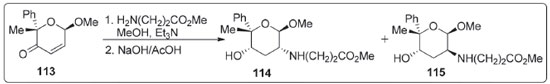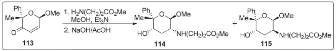 Outra metodologia de síntese de aminoaçúcar a partir de enonas foi realizada por Apostolopoulos e colaboradores,117 pela adiçao de aminoácidos ao 5-C-substituído 2,3-didesoxi-hex-2-enopiranosid4-ulose 113, seguido de uma reaçao de reduçao para fornecer os compostos 114 (68%) e 115 (9%) com boas estereoseletividades (Esquema 22).