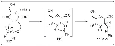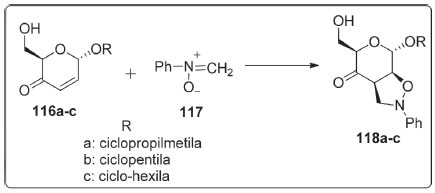 ![]() Esquema 23. Cicloadiçao 1,3-dipolar de N-fenilnitrona ao O-glicosídeo 2,3-insaturados 116a-c