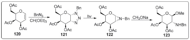 Outros exemplos de reaçao 1,3-dipolar para a síntese de aminoaçúcares foi relatado por Dahl e colaboradores (Esquema 25).119,120 Nessa síntese o galactal 120 reagiu com azidas benzílicas em trietilortoformato como solvente para fornecer o intermediário triazolina 121, o qual por irradiaçao forneceu a N-benzil aziridina 122. Segundo os autores, o tratamento adicional da reaçao com uma base forte proporcionou formaçao de um derivado de aminoglicosídeo. Tal cicloadiçao dipolar pode ser usada para obter 2-amino-2-desoxiglicosídeo 123.