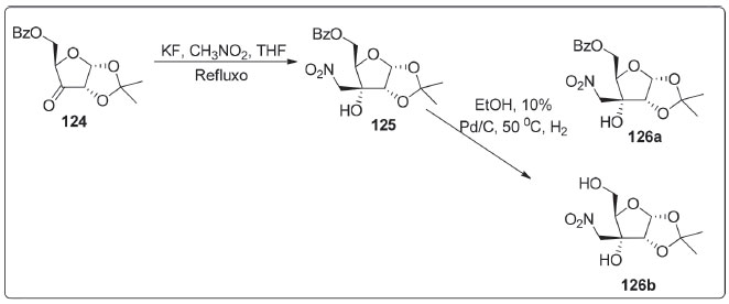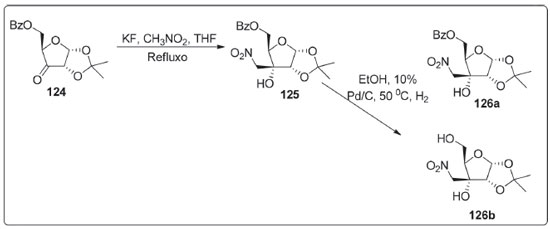 A literatura também cita a síntese de precursores de aminoaçúcares através da adiçao 1,3-dipolar de diazometano a dupla ligaçao de hexenulose121 e cicloadiçao 1,3-dipolar de fenilazida a diferentes hexenuloses.122 Síntese de aminoaçúcares a partir de outras rotas sintéticas Ji e colaboradores123 relataram a síntese de diversos aminoacúcares derivados a partir de cetoaçúcares proveniente da D-xilose através de uma série de reaçoes, por exemplos a reaçao de Henry, reaçoes de hidrogenaçao e reaçoes de adiçao nucleofílica ou reaçoes de substituiçao. Segundo os autores em presença de KF, a adiçao de nitrometano ao grupo carbonila de 5-O-benzoil-1,2-O-isopropilideno-D-eritro-cetofurano-3-ulose 124 ocorreu estereosseletivamente para fornecer apenas o isômero 125 com configuraçao ribo e rendimento de 95% (Esquema 26). A presença de um grupo nitro na estrutura foi confirmada por análise de infravermelho e a configuraçao absoluta de todos os átomos de carbono assimétricos foi determinada pela análise de difraçao de raios-X. A estereoseletividade provavelmente resultou no impedimento estérico do grupo 1,2-O-isopropilideno. A etapa seguinte consistiu na hidrogenaçao catalítica de 125 sob condiçoes neutras, que levou a uma mistura dos compostos 126a e 126b, os quais foram isolados por cromatografia em coluna um sistema de MeOH-CHCl3 1:15 para fornecer o composto desejado 126a em 75% de rendimento e o composto 126b, com 10% de rendimento. A estrutura de 126a foi confirmada pelos espectros 1H, 13C, RMN 2D, HRMS e por cristalografia de raios-X.