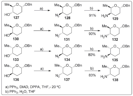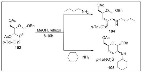 Outras estratégias sintéticas que têm sido empregadas na síntese de aminoaçúcares, incluindo reaçao de substituiçao em vários átomos de carbono do anel piranosídico ou furanosídico, sao bem descritas em revisao publicada no ano de 2016 e em artigos nela citada.8