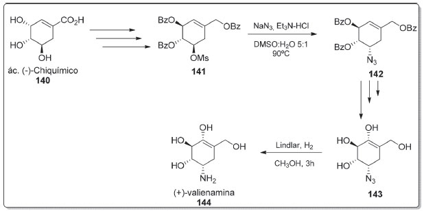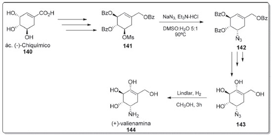 Em 2015, Ding e colaboradores126 descrevem a síntese estereosseletiva do pseudo-aminoaçúcar (+)-valienamina 144 a partir do ácido (-)-chiquímico 140 com rendimento global de 38,3% através de 13 etapas reacionais (Esquema 28). Entre essas etapas reacionais, destaque é dado à azidaçao através de uma substituiçao nucleofílica do tipo SN2 do grupo Oms do C-5 com azida de sódio e cloridrato de trietilamina, proporcionando o composto 142 com rendimento de 90%. A configuraçao (R) de C-5 foi invertida para a configuraçao (S) através de uma inversao do tipo Walden. Após algumas etapas reacionais, foi promovida a hidrogenaçao altamente seletiva do grupo azido (N3), transformando-o no grupo amina, utilizando o catalisador de Lindlar e convertendo na (+)-valienamina 144 com rendimento de 91%.