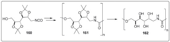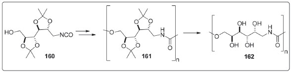 Devido às boas propriedades térmicas e mecânicas, as poliamidas do tipo Nylo constituem um dos grupos mais importantes de polímeros de condensaçao e sao amplamente utilizadas na indústria para moldagem por injeçao e aplicaçoes de filme ou fibra. Assim, a preparaçao de poliamidas do tipo Nylon mais hidrofílicas e degradáveis a partir de monômeros a base de açúcar representa um grande desafio. As primeiras sínteses de poliamidas à base de açúcar produziram apenas fibras frágeis e de baixo peso molecular. Os monômeros de açúcar necessários para a síntese de poliamidas sao diaminossacarídeos, ácidos aldáricos ou ácidos aminoaldônicos. A introduçao de grupo amino é geralmente realizada através de um éster sulfonato, a partir de um deslocamento do tipo SN2 por azida, seguido de uma reaçao de hidrogenaçao.166 Koning et al.167 descreveram homo- e copoliamidas totalmente de base biológica a partir de ácido sebácico, 2,5-diamino-2,5-didesoxi-1,4,3,6-dianidroiditol (diaminoisoidida, 156) e 1,4-diaminobutano. Poliamidas de baixo peso molecular foram obtidas por poli-condensaçao dos sais à base desses monômeros ou por poli-condensaçao interfacial. Poliamidas de maior peso molecular foram obtidas por polimerizaçao em estado sólido (SSP) dos pré-polímeros. As técnicas de FT-IR e raios-X foram utilizados para a investigaçao da estrutura cristalina dos polímeros após o SSP. Conformaçao local e co-cristalizaçao dessas poliamidas à base de diaminoisoidídeos foram estudadas por FT-IR, RMN de estado sólido e WAXD.168 Os poliuretanos têm sido extensivamente estudados nas últimas décadas, e têm sido objetos de inúmeras patentes, documentos e livros. Eles sao usados principalmente como materiais de mercadoria e em aplicaçoes industriais. No entanto, como alguns deles sao biodegradáveis e biocompatíveis, e seu uso em aplicaçoes médicas está sendo amplamente investigado devido à baixa toxicidade, biodegradabilidade potencial, biocompatibilidade e estruturas versáteis, que os tornam adequados como parte de sistemas de administraçao de medicamentos, como curativos dermatológicos, como materiais hemocompatíveis para cateteres e como filtros em instrumentaçao e dispositivos biomédicos. Gómez e Varela169 descreveram a síntese de um [AB]-poliuretano estereorregular 162 a partir do 1-desoxi-1-isocianato-2,3:4,5-di-O-isopropilideno-D-galactitol 160. Segundo os autores a hidrólise dos grupos isopropilideno de 161 forneceu o polihidroxi [n]-poliuretano 162 (Esquema 30); no entanto, os estudos de degradaçao hidrolítica nao foram realizados.