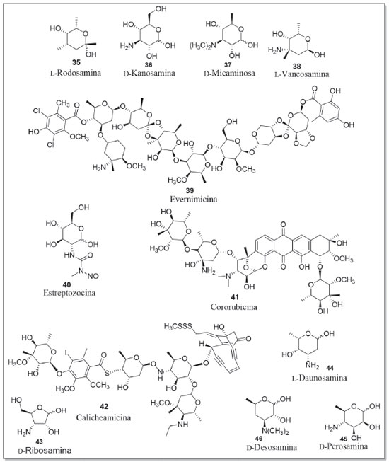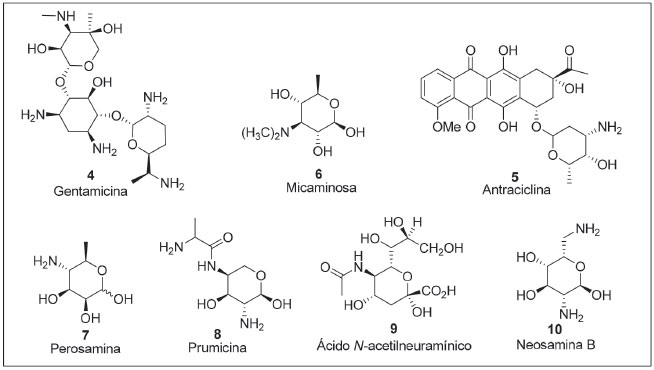 Outros aminoaçúcares de origem natural sao frequentemente constituintes de diferentes produtos do metabolismo secundário, incluindo antibióticos. A micosamina está presente nos antibióticos antifúngicos, anfotericina B e nistatina.47,48 A ribosamina é um componente da puromicina, a desosamina está presente na eritromicina, a daunosamina ocorre no anticâncer antraciclina daunomicina e diferentes açúcares aminados e seus derivados sao encontrados nos antibióticos antibacterianos aminoglicosídeos. Em cada caso, a porçao aminoaçúcar é importante para a atividade biológica desses antimicrobianos.49