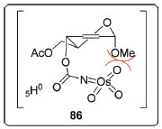 Por outro lado, segundo os autores, a reaçao foi bem sucedida com o produto de partida 82, derivado do tri-O-acetil-D-galactal. Nao obtiveram sucesso quando utilizaram o substrato, obtido a partir do tri-O-acetil-D-glical. Segundo eles, o resultado foi negativo quando se utilizou o tri-O-acetil-D-glical, porque de acordo com a conformaçao meia cadeira mais estável 5HO para o complexo intermediário 88 (Figura 4), observa-se um considerável impedimento estérico ao ataque das espécies de Os-imido com a parte aglicônica.