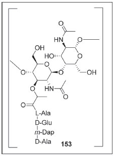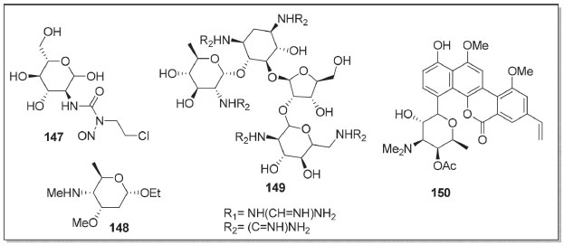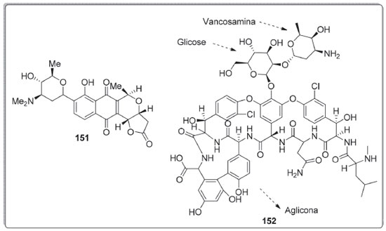 A Figura 7 apresenta outros exemplos de compostos que contém aminoaçúcares nas estruturas, tais como, medermicina 151132 e vancomicina 152.133-136 O antibiótico medermicina tem aplicaçao na síntese de biomoléculas e na agregaçao plaquetária. A vancomicina, um antibiótico glicopeptídeo contendo o açúcar L-vancosamina como unidade de aminoaçúcar, tem aplicaçao no tratamento de infecçoes por bactérias gram-positivas resistentes a meticilina. Os aminoaçúcares sao ainda utilizados também na síntese de oligossacarídeos.137