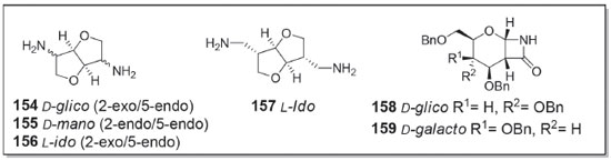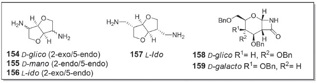 Em bactérias gram-positivas, 90% da parede celular consistem em peptidoglicano, enquanto em bactérias gram-negativas, esse número varia de 5-20%.149 Acredita-se que os fungos contenham apenas glicosamina e galactosamina.150 Além disso, os exoesqueletos de invertebrados contêm quitina, um polímero de N-acetilglicosamina.151 Sabe-se que a glicosamina foi encontrada no revestimento intestinal de minhocas, nas cascas dos ovos dos nematoides, nos polissacarídeos dos moluscos e na gelatina do caracol.152 No entanto, as concentraçoes de aminoaçúcares e ácido murâmico sao aplicadas rotineiramente para indicar contribuiçoes microbianas à matéria orgânica do solo (MOS).153-155 Glaser e colaboradores156 investigaram o padrao, quantidade e dinâmica de três aminoaçúcares (glicosamina, manosamina e galactosamina) e ácido murâmico na biomassa microbiana total de bactérias, fungos e actinomicetos seletivamente cultivados de cinco solos diferentes, com e sem glicose. Na indústria de polímeros e têxteis A incorporaçao de unidades derivadas de açúcar em polímeros tradicionais de crescimento em etapas, tais como poliamidas e poliésteres, é potencialmente um método de interesse para preparar novos materiais biodegradáveis e biocompatíveis para aplicaçao em produtos biomédicos e outros setores de maior consumo, como embalagens de alimentos.157,158 As principais razoes para esse interesse sao a grande abundância de açúcares naturais, sua diversidade estrutural, suas múltiplas funcionalidades e a sua natureza hidrofílica dos materiais resultantes, resultando em maior degradabilidade hidrolítica.159 Além disso, seu impacto ambiental é menor que o dos polímeros clássicos.160 Entretanto, embora os polímeros tenham sido sintetizados usando monômeros derivados de açúcar com grupos hidroxila livres,161-163 a maioria das sínteses de polímeros lineares de alto peso molecular envolve derivados que possuem grupos hidroxila adequadamente protegidos.164 Logo, vários monômeros de aminoaçúcares (154-159) têm sido amplamente utilizados para preparar poliamidas, poliuretanos e poliureias (Figura 9).165