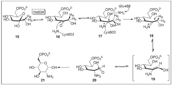 ROTAS BIOSSINTÉTICAS DE AMINOACUCARES Os aminoaçúcares podem ser obtidos através de rotas sintéticas e biossintéticas. Na rota biossintética, a conversao de um monossacarídeo - geralmente na forma de açucar fosfatado ou de nucleotídeo glicosilado - é catalisada por uma enzima aminotransferase PLP-dependente ou amidotransferase PLP-independente, de maneira estereoespecífica. Por outro lado, a sua síntese será possível através de precursores, tais como álcoois, aldeídos, ácidos carboxílicos, ésteres e lactonas ou aminoácidos ou pela introduçao regio- e estereoespecífica de uma funcionalidade amino em açúcares apropriados, ou substrato derivado de açúcar por substituiçao nucleofílica ou adiçao. Inicialmente discutiremos as rotas biossintéticas para obtençao de aminoaçúcares derivados do metabolismo primário e secundário numa abordagens diferentes e mais completa do que foi descrito por Skabec e Milewska.8 Aminoaçúcares derivados do metabolismo primário Uma rota biossintética para obtençao de aminoaçúcares no metabolismo primário envolve a transferência do grupo amino de um doador de aminoácido (geralmente L-glutamato ou L-glutamina) para a funçao ceto de um derivado de cetose na forma aberta ou para o átomo de carbono ceto gerado na reaçao anterior após oxidaçao de um C-OH da forma cíclica de um derivado da aldose. A transferência de grupo amino é catalisada pela enzima aminotransferase PLP-dependente ou amidotransferase PLP-independente, de maneira estereoespecífica. O substrato aceitador do grupo amino é geralmente um açúcar fosfatado ou um nucleotídeo glicosilado. A única reaçao desse tipo no metabolismo primário dá origem a α-D-glicosamina-6P (21) a partir de β-D-frutose-6P (15). Essa reaçao é catalisada por L-glutamina: β-D-frutose-6P amidotransferase (isomerizaçao da hexose), cujo nome trivial é glicosamina-6P (GlcN-6-P) sintase. A enzima é amplamente distribuída na natureza e está presente em quase todos os organismos vivos. Segundo Adam,50 no protozoário Giardia lamblia, o GlcN-6P é formado a partir de Fru-6-P e amônia sobre catálise com GlcN-6P desaminase, uma enzima catabólica em todos os outros organismos. A GlcN-6-P sintase nao requer nenhuma coenzima e catalisa reaçao complexa, irreversível, que envolve transferência do grupo amida de L-glutamina para β-D-Fru-6P e subsequente isomerizaçao da cetose para o intermediário frutoseimina 19, Esquema 2.