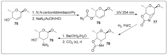 Dando continuidade, Lafont et al.94 demonstraram que os derivados de 6-amino-1,6-anidro-6-desoxiaçúcar (série D-glico, D-galacto, D-mano), podem ser preparados pelo tratamento de 1,2-trans-2-desoxi-2-iodo-β-D-glicopiranosilazida 72, com trifenilfosfina. O ataque nucleofilico do nitrogênio em C-2 produz uma aziridina intermediaria instável, que é aberta pelo álcool na posiçao anomérica. Síntese de aminoaçúcares a partir de glicosídeos 2,3-insaturados Em 2006, Mendlik e colaboradores95 descreveram um método de aziridinaçao fotoinduzida para a preparaçao da L-daunosamina e L-ristosamina. Na reaçao foi utilizado a L-treo-hex-2-enopiranosídeo 75 como material de partida para esta síntese (Esquema 12). O intermediário 76 sofreu uma irradiaçao com luz UV de 254 nm onde foi convertido em um derivado de aziridina 77. Para a abertura regiosseletiva do anel da aziridina 77, o mesmo foi submetido a uma reaçao de hidrogenaçao catalisada por Pd/C, seguido do tratamento com hidróxido de bário, originando o composto desejado 79 em rendimento de 87%.