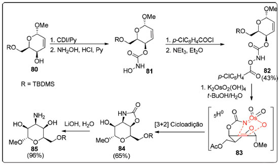 Outro método usado para introduçao da funcionalidade amino em glicosídeos 2,3-insaturados é a amina-hidroxilaçao catalisado por ósmio. O método consistiu em uma das etapas, sintetizar a oxazolidinona 84, como intermediário e em seguida a mesma é hidrolisada em uma soluçao aquosa de hidróxido de lítio para fornecer o composto 85 em rendimento de 96% e completa syn-diastereosseletividade. A síntese do metil-3-amino-3-desoxi-D-talopiranosídeo 85 é mostrada no Esquema 13.96