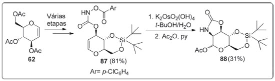 Mirabella e colaboradores96 também descreveram um protocolo de amina-hidroxilaçao dos derivados de hexenopiranosideo 87 protegidos (Esquema 14) - obtidos a partir de tri-O-acetil-D-glical 62, em cinco etapas e através de rearranjo Ferrier - e obtiveram o composto 88 em rendimento de 31%.