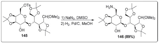 Em 2015, Corsi et al.127 descreveram a síntese de derivados de aminoaçucar via intermediário de N-benzilamina, através da substituiçao do grupo tosilato por azida Nessa síntese os autores utilizaram solventes apróticos polares como N,N-dimetilformamida (DMF) ou dimetilsulfóxido (DMSO) e obtiveram o composto 146 em rendimento de 89% (Esquema 29).