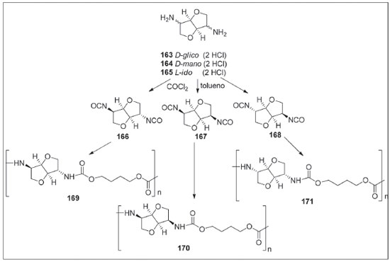 Embora, segundo Lu et al.,170 algumas poli (uretano-ureia) degradáveis baseadas em recursos renováveis - como a L-cistina - tenham despertado certo interesse, porque poderiam potencialmente ser aplicadas como biomateriais temporários, as poliureias à base de açúcar atraíram menos atençao até hoje. Thiem et al.171 descreveram a preparaçao de poliureias à base de açúcar: inicialmente, o diamino dihidrocloreto (165-167) foi reagido com fosgênio em tolueno (Esquema 31) para fornecer os diisocianatos (166-170) em bons rendimentos. Em seguida, através de uma reaçao de poliadiçao, os polímeros 169-171 sao obtidos em bons rendimentos.