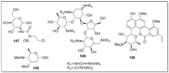 APLICAÇOES DE AMINOACUCARES Na Medicina Assim como os açúcares de cadeia ramificada e cetoaçúcares, os aminoaçúcares tem aplicaçoes farmacológicas, pois alguns possuem atividade antitumoral como a clorozoticina 147.128 Já a holocosamina 148 (Figura 6) apresenta atividades antifúgica129 e cardiotônica.130 Todavia, a guanidioneomicina 149 possui atividade anti-HIV. Futagami e colaboradores131 demostraram em seu trabalho a síntese total da ravidomicina 150, um aminoaçúcar antibiótico com atividade antitumoral.