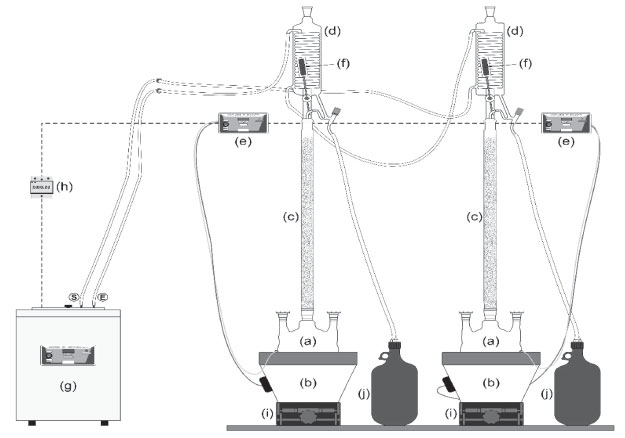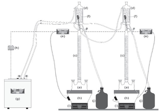 Figura 1. Representaçao ilustrativa do sistema de destilaçao para recuperaçao de solventes, dotado de: (a) baloes Pyrex de três vias e 5 L de capacidade volumétrica; (b) mantas aquecedoras Fisaton; (c) colunas Pyrex preenchidas com anéis de Raschig; (d) condensadores Pyrex tipo serpentina; (e) sistemas digitais de controle de aquecimento Biothec modelo BTDS5; (f) termômetros digitais Incoterm; (g) banho ultratermostatizado para recirculaçao de água Biothec modelo BT80UR; (h) medidor de energia monofásico Hiking modelo DDS238-4; (i) plataforma elevatória; (j) frasco coletor