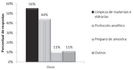 A aplicaçao do questionário permitiu também identificar em qual etapa de trabalho esses solventes estavam sendo reutilizados. Nota-se na Figura 3, que além da utilizaçao na limpeza de materiais e vidrarias, que representa um uso menos nobre, tem-se um significativo uso em etapas de trabalho de processos analíticos. O item "Outros" na Figura 3 representa um uso específico em um banho criogênico (gelo seco + etanol). Como complemento, quando provocados a opinar sobre a qualidade desses produtos, a totalidade dos entrevistados respondeu ser satisfatória, o que serve para corroborar ainda mais a qualidade e o incentivo ao uso dos solventes recuperados.