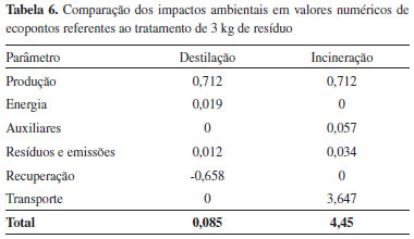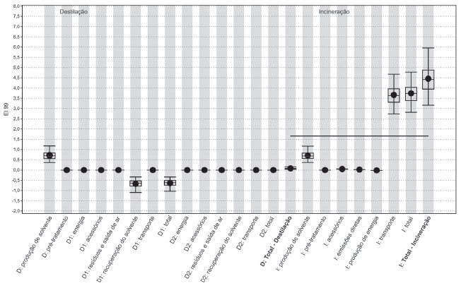 A soma dos valores contabilizados nos parâmetros acima elencados totaliza R$83.896,00, o que resulta em estimativa de custo da ordem de R$5,50 para cada quilograma de acetona recuperada. Comparando esse valor com o custo de aquisiçao de 1 kg do produto comercial, na ordem de R$35,00 (com base no valor de R$28,00 o litro), mais o custo do encaminhamento da mesma massa de resíduo para incineraçao no valor de R$10,00, conclui-se que o custo da destilaçao é cerca de 8 vezes menor que o da compra do produto somada à incineraçao do resíduo. Ressalta-se, ainda, que seria possível economizar R$39,50 por cada quilograma recuperada, ou R$119,00 a cada batelada diária, permitindo que o custo da aquisiçao de um sistema completo de destilaçao como esse seja pago em 160 dias úteis ou 8 meses. Comparaçao destilaçao x incineraçao Para quantificaçao dos impactos ambientais da destilaçao pelo Ecoindicator 99 foram consideradas as seguintes informaçoes: processo único em batelada; sem a realizaçao de pré-tratamentos; sem uso de auxiliares; destinaçao da sobra da destilaçao para estaçao de tratamento de esgoto (considerou-se essa alternativa de encaminhamento para o resíduo utilizado na pesquisa, pois sua composiçao é compreendida majoritariamente por água, nao apresentando compostos com potenciais de causarem danos a rede de esgoto e ao meio ambiente, nao sendo recomendada esta destinaçao para todas as sobras provenientes da destilaçao de demais resíduos com diferentes composiçoes); sem trans-porte dos resíduos até o destilador; absorçao como tratamento para os vapores orgânicos emitidos; dados obtidos durante os testes realizados (consumo de energia, quantidade e qualidade do solvente recuperado). Para a incineraçao, considerou-se os impactos provenientes de incinerador industrial de produtos perigosos e com uma distância de 170 km percorrido no transporte do resíduo (equivalente à distância entre Piracicaba e Taboao da Serra, principal destino dos resíduos perigosos enviados pelo CENA/USP para fins de incineraçao). Os resultados apresentados na Figura 5 trazem a comparaçao entre o dois tratamentos aplicáveis, sendo os resultados positivos representativos de encargos ambientais e os resultados negativos representativos de créditos ambientais. Nota-se, no caso da destilaçao, indicada pela letra D, apenas a contabilizaçao dos impactos em D1, pois os tratamentos realizados sempre ocorreram em apenas uma etapa, sendo D2 representativo de uma possível segunda etapa de destilaçao. A Tabela 6 apresenta os ecopontos em valores numéricos para os principais parâmetros considerados.