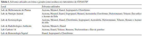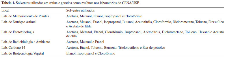 RESULTADOS E DISCUSSAO Diagnósticos da gestao de resíduos De forma a diagnosticar as etapas envolvidas na manipulaçao dos solventes e na gestao dos resíduos gerados, foram visitados os Laboratórios de Melhoramento de Plantas, Nutriçao Animal, Ecotoxicologia, Radiobiologia e Ambiente, Carbono 14 e Biotecnologia Vegetal, tendo sido entrevistados colaboradores desses setores. Dentre as informaçoes obtidas, pode-se destacar aquela que inventaria os solventes orgânicos usados nas rotinas em cada laboratório gerador de resíduos e cuja relaçao é discriminada na Tabela 1.