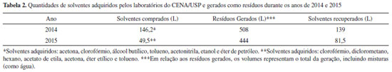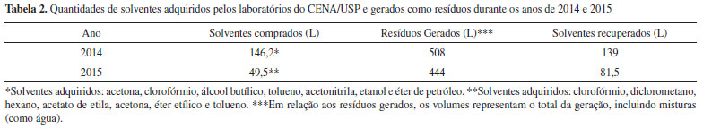 Uma última etapa do diagnóstico envolveu o trabalho de coleta de dados junto ao Setor de Compras e Almoxarifado para fins de comparaçao com os registros de coleta de resíduos contendo solventes no mesmo período (2014/2015). Esses dados estao representados na Tabela 2 e ilustram um baixo volume de solventes comprados, principalmente no ano de 2015, enquanto o volume de resíduos coletados foi bastante superior. Essa diferença quantitativa pode ser explicada pela disponibilidade em estoque dessas substâncias nos laboratórios, evitando a necessidade de compras; por eventuais compras sem o conhecimento dos setores administrativo e financeiro da instituiçao (compra direta); ou por pesquisas realizadas em parceria com outras instituiçoes, sendo os reagentes comprados com verba dessas instituiçoes e os resíduos gerados no CENA. De todo modo, o referido diagnóstico é um indicador de que a gestao de compras e estocagem desses solventes é passível de aprimoramento, o que conduz a um cenário no qual a fiscalizaçao pelos órgaos competentes (Policia Federal) tem se mostrado cada vez mais rígida. Para isso, se faz necessária a criaçao de mecanismos que possibilitem um real conhecimento das substâncias que entram na Instituiçao, como a criaçao de um sistema informatizado para pedidos de compras e um almoxarifado central para recebimento e estocagem dos produtos químicos, levando em consideraçao ainda a agilidade e a segurança no processo.