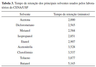 Estabelecidas as condiçoes analíticas, criou-se um banco de dados com os tempos de retençao dos principais solventes utilizados na Instituiçao (Tabela 3), para serem usados nas futuras identificaçoes desses compostos em outras soluçoes residuais de interesse e, principalmente, para avaliar a eficiência do processo de destilaçao, analisando a presença dessas moléculas, assim como possíveis contaminantes no produto recuperado.