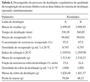 Nota-se, principalmente para os solventes metanol e diclorometano, assim como para clorofórmio e acetonitrila, que os tempos de retençao se mantiveram muito próximos, mesmo tendo sido testados outros valores de vazao do gás e de temperaturas de aquecimento do forno. O limitante nessa questao recai sobre a coluna usada, sendo a mesma nao possuidora de comprimento e/ou espessura do filme suficientes para uma melhor separaçao dessas substâncias, porém, isso nao se tornou um fator agravante para o desenvolvimento da pesquisa. Em relaçao aos demais parâmetros de qualidade, os resultados observados estao apresentados e discutidos à seguir, conjuntamente ao estudo das variáveis do processo de recuperaçao de solventes, utilizando-se acetona como matriz residual a ser destilada. Avaliaçao do processo de recuperaçao de acetona Em relaçao às temperaturas de aquecimento testadas em ambas linhas (A e B), foram notadas pequenas diferenças no tocante a pureza do solvente recuperado, evidenciando a eficiência do processo de purificaçao mesmo nas maiores temperaturas avaliadas. Já em relaçao aos valores aferidos de densidade, foi possível notar um moderado aumento conforme se aumentaram as temperaturas de aquecimento das mantas, evidenciando um crescente arraste indesejável de água junto à acetona. Em contrapartida, o aumento das temperaturas proporcionou menores tempos de destilaçao e consequentemente menores consumos de energia, mesmo com a elevaçao da potência do sistema de aquecimento. A partir da tendência encontrada, segundo a qual aumentandose a temperatura ocorre diminuiçao na pureza, na concentraçao do solvente recuperado, no tempo de destilaçao, no consumo de energia e na perda de massa de acetona no processo, elegeu-se como melhor condiçao operacional as temperaturas mínimas de aquecimento que permitiram atingir os 56 ºC no topo das colunas das linhas A e B, as quais foram utilizadas nos testes comparativos, realizados em triplicatas. Mesmo nao havendo sido encontradas diferenças muito acentuadas entre os parâmetros avaliados, a opçao pelo uso dessas temperaturas permitiria a obtençao de um produto recuperado com excelente pureza em um período de tempo que nao ultrapassasse 6 horas de destilaçao. Na Tabela 4 constam os principais parâmetros mensurados operando-se simultaneamente as duas linhas na destilaçao de um resíduo com concentraçao de acetona de 59% (m/m) e densidade de 0,911 g mL-1 a 21 ºC. Ressalta-se que, nesssas condiçoes, o consumo total de energia aferido foi de 3,8 kwh.