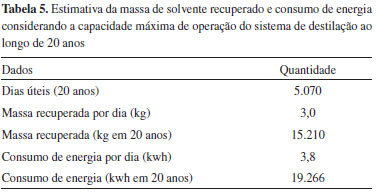 Na aferiçao do balanço energético no processo, comparando-se a operaçao das linhas A e B operando individual ou simultaneamente, tem-se nessa última condiçao uma diminuiçao do consumo de energia em 27%, mantendo os mesmos valores de pureza e concentraçao do produto recuperado. Isso ocorre devido ao melhor aproveitamento do banho ultratermostatizado, já que o mesmo promove a recirculaçao da água nas duas linhas, independente de qual esteja em funcionamento. As análises cromatográficas e de densidade comprovaram a elevada qualidade possível de se obter em um solvente recuperado pelo processo de destilaçao avaliado, assegurando-se a obtençao de um produto livre de contaminantes que possam causar interferências nos procedimentos em que o produto seja empregado. Por sua vez, quando se avaliou o índice de refraçao nas amostras de solvente recuperado nas linhas A e B, obteve-se diagnóstico semelhante, visto que o índice de refraçao da acetona é da ordem de 1,3588 nD (20 ºC),26 valor esse muito próximo ao encontrado nos testes realizados. Tendo como referência os resultados desse parâmetro, permite-se estimar em aproximadamente 98% a concentraçao de acetona nos solventes, através da relaçao direta com os índices de refraçao de misturas binárias de acetona e água.25 Tal concentraçao é equivalente àquela possível de ser estimada a partir da densidade do solvente recuperado. No que se refere à estimativa dos custos envolvidos no processo de destilaçao, tem-se os parâmetros fixos e variáveis. O custo de aquisiçao do sistema dedicado para destilaçao, composto pelas duas linhas e banho de circulaçao ultratermostatizado, é da ordem de R$19.000,00 (US$4,935.00). Fixou-se para esse conjunto uma vida útil estipulada em 20 anos. Visando o aproveitamento máximo do sistema, considerou-se que ao longo do período estipulado, o mesmo estaria em operaçao todos os dias úteis com as duas linhas trabalhando simultaneamente e destilando uma massa de 3 kg de resíduo por linha/dia. Para fins de tabulaçao, na operaçao do sistema de destilaçao mais as realizaçoes das análises, considerou-se a dedicaçao de 30 minutos diários de um técnico de laboratório com salário mensal de R$3.933,26 e fixou-se em R$0,50 por kwh o valor da tarifa cobrada pela concessionária responsável pelo fornecimento de energia. Como simulaçao desse cenário, em período de 20 anos, a Tabela 5 resume as informaçoes utilizadas nos cálculos de interesse.