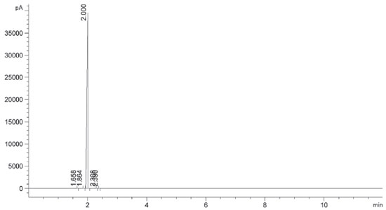 Figura 4. Cromatograma de acetona P.A-A.C.S nas condiçoes definidas (Coluna HP-INNOWAX, 30 m x 0,25 mm, espessura do filme de 0,15 μm; fase móvel: nitrogênio a 1,5 mL.min-1; temperatura do injetor: 200 ºC; temperatura da coluna: 40 ºC por 2 minutos a 190 ºC a 15 ºC min-1; detecçao por ionizaçao em chama, 300 ºC)