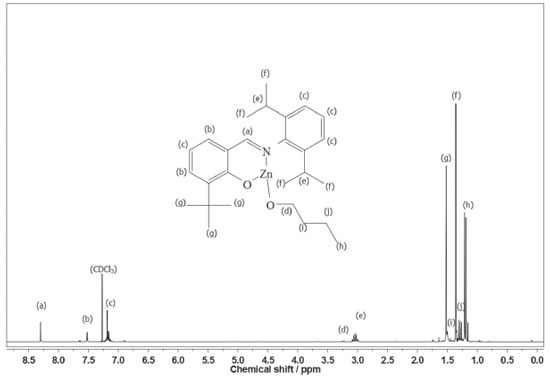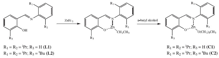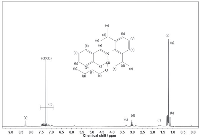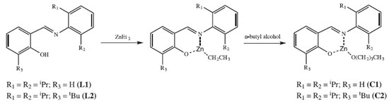 EXPERIMENTAL Materials The preparation of the zinc(II) complexes and the polymerization reactions were carried out under inert atmosphere using Schlenk-type glassware and glove bags. Toluene was dried over Na-benzophenone ketyl under N2. Salicylaldehyde, 3-tert-butyl-2-hydroxybenzaldehyde, 2,6-diisopropylaniline (Aldrich) and diethylzinc (ZnEt2) (15 wt% solution in hexane) (Akzo Nobel) were purchased from commercial sources and used as received. Butyl alcohol (Aldrich) was dried over molecular sieve. Polymerizations were performed using L-lactide (Purac) recrystallized from dry toluene. Synthesis of 2-((2,6-diisopropylphenylimine)methyl)phenol (L1) L1 was prepared according to a procedure described in the literature with some modifications.23-25 An ethanolic solution (15 mL) of salicylaldehyde (0.86 mL, 8.19 mmol) was added dropwise to a solution of 2,6-diisopropylaniline (1.56 mL, 8.19 mmol) in the same solvent (15 mL). The reaction mixture was refluxed for 3 hours and kept under stirring overnight. Then, the resulting yellow solution was cooled, leading to the formation of a yellow precipitate, which was filtered off and washed with hexane. Yield: 62%. Melting point (M.p.): 61-62 °C. FTIR (ATR, ±4 cm-1): 3500-3300 cm-1 (νO-H); 3100-2800 cm-1 (νC-H); 1626 cm-1 (νC=N, imine); 1572 and 1462 cm-1 (νC=C, aromatic); 1277 cm-1 (νC-N); 1173 cm-1 (νC-O, phenol). 1H NMR (400 MHz, CDCl3, 25 °C): δ 10.15 (s, 1H, OH phenol); δ 8.29 (s, 1H, CH=N); δ 7.50-7.0 (m, 7H, ArH); δ 3.01 (m, 2H, CH); δ 1.5-1.0 (m, 12H, CH3). Synthesis of 2-tert-butyl-6-((2,6-diisopropylphenylimine) methyl)phenol (L2) L2 was prepared using a procedure similar to that described for L1. An ethanolic solution (15 mL) of 3-tert-butyl-2-hydroxybenzaldehyde (1.00 g, 5.61 mmol) was added dropwise to a solution of 2,6-diisopropylaniline (0.8 mL, 5.61 mmol) in the same solvent (15 mL). The reaction mixture was refluxed for 3 hours and kept under stirring overnight. Thereafter, the resulting yellow solution was cooled, leading to the formation of a yellow solid, which was filtered off and washed with hexane. Yield: 60%. M.p.: 95-97 °C. FTIR (ATR, ±4 cm-1): 3500-3300 cm-1 (νO-H); 3100-2800 cm-1 (νC-H); 1623 cm-1 (νC=N, imine); 1585 and 1465 cm-1 (νC=C, aromatic); 1250 cm-1 (νC-N); 1166 cm-1 (νC-O, phenol). 1H NMR (400 MHz, CDCl3, 25 °C): δ 10.25 (s, 1H, OH phenol); δ 8.30 (s, 1H, CH=N); δ 7.5-7.0 (m, 5H, ArH); δ 3.05 (m, 2H, CH); δ 1.5-1.0 (m, H, CH3). Synthesis of [Zn(L1)(OBu)] (C1) Complex C1 was prepared according to a procedure described in the literature with some modifications.26-31 In a 25 mL Schlenk tube, ZnEt2 (15 wt% solution in hexane) (1.46 mL, 1.78 mmol) was slowly added to a solution of L1 (0.50 g, 1.78 mmol) in dry toluene (15 mL). The reaction mixture was stirred overnight at room temperature. After this period, 0.16 mL (1.78 mmol) of n-BuOH was added, and the reaction mixture was kept under stirring for additional 3 hours. The resulting greenish-yellow solid was filtered off, washed three times with dry toluene, and dried under vacuum. Yield: 80%. M.p.: >300 °C. Elemental analysis for [Zn(C19H22NO) (O(CH2)3CH3)]: (Calcd. (Found)) C, 65,99 (66.20); H, 7.40 (7.20); N, 3,36 (3,45). 1H NMR (400 MHz, CDCl3, 25 °C): δ 8.29 (s, 1H, CH=N); δ 7.50-6.96 (m, 7H, ArH); δ 3.31 (m, 2H, OCH2); δ 2.05 (m, 2H, CH); δ 3.31-3.05 (m, 2H, (CH2) butyl alcohol); δ 2.05 (m, 2H, (CH2) butyl alcohol); δ 1.28-1.20 (m, 12H, Pr(CH3)); δ 1.14 (m, 3H, (CH3) butyl alcohol). Synthesis of [Zn(L2)(OBu)] (C2) Complex C2 was prepared using a procedure similar to that described for C1.26-31 In a 25 mL Schlenk tube, ZnEt2 (15 wt% solution in hexane) (1.22 mL, 1.48 mmol) was slowly added to a solution of L2 (0.50 g, 1.48 mmol)) in dry toluene (15 mL). The reaction mixture was stirred overnight at room temperature. After this period, 0.14 mL (1.48 mmol) of n-BuOH was added, and the reaction mixture was kept under stirring for additional 3 hours. The resulting greenish-yellow solid was filtered off, washed three times with dry toluene, and dried under vacuum. Yield: 85%. M.p.: >300 °C. Elemental analysis for [Zn(C23H30NO)(O(CH2)3CH3)]: (Calcd. (Found)) C, 68.32 (69.18); H, 8.22 (8.30); N, 2.95 (3.11). 1H NMR (400 MHz, CDCl3, 25 °C): δ 8.30 (s, 1H, CH=N); δ 7.58-7.18 (m, 6H, ArH); δ 3.05 (m, 2H, 2xCH); δ 3.30-2.86 (m, 2H, OCH2); δ 1.34 (m, 2H, (CH2) butyl alcohol); δ 1.52 (s, 9H, tBu(CH3)3); δ 1.29 (s, 12H, 4xiPr(CH3)); δ 1.22 (m, 2H, (CH2) butyl alcohol); δ 1.15 (m, 3H, (CH3) butyl alcohol). Characterization of ligands and complexes 1H NMR spectra were recorded at 25 °C on a Varian Mercury VX spectrometer using CDCl3 as internal reference. FTIR spectra were recorded on a Frontier FTIR/FIR using the Attenuated Total Reflectance (ATR) technique. Melting points were determined using a Quimis equipment (model 0340513) with controlled heating. Elemental analyses were performed on a HANAU Elementar vario MICRO cube. L-Lactide polymerization The activity of C1 and C2 toward bulk ROP of L-lactide (LLA) was investigated using the following monomer/initiator (LLA/Zn) molar ratios: 500, 1000 and 2500. Each mixture containing the desired amount of initiator and L-lactide (about 2 g) was prepared in a Schlenk flask under N2. Each polymerization reaction was conducted at 180 °C for 2 h.3,4 After this period, the reaction was quenched by cooling to room temperature. Then, the solid residue was dissolved in chloroform, and the polymer was precipitated from ethanol. The isolated polymers were dried under vacuum at 50 °C. Polymers characterization 1H and 13C NMR spectra were recorded at 25 °C using a Varian Mercury VX-300 NMR spectrometer and CDCl3 as internal reference. Gel permeation chromatography (GPC) was carried out on a Shimadzu LC 20 instrument equipped with a set of two Phenogel columns and RID-20A differential index detector. GPC analyses were performed at 25 °C using chloroform as eluent at a 1 mL min-1 rate. A cal