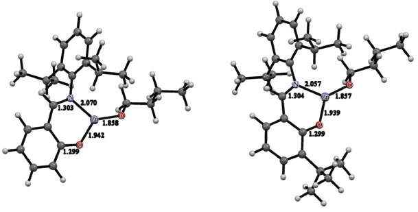 DFT calculations at the B3LYP/LACV3P** level were used to elucidate the molecular structures of C1 and C2. The geometries optimized for C1 and C2 are depicted in Figure 4. The geometric parameters obtained for both complexes are very similar. In both alkoxides, the metal center is three-coordinated and displays a trigonal planar coordination geometry, which is essential for the activity in ROP of cyclic esters.9 In C1, the Zn-N, Zn-OPhO and Zn-OBuO distances amount to 2.070, 1.942 and 1.858 Å, respectively. In C2, the Zn-N, Zn-OPhO and Zn-OBuO distances are equal to 2.057, 1.939 and 1.857 Å, respectively. Regardless of the complex, the Zn-OBuO distance is more than 0.08 Å shorter than the Zn-OPhO distance. The N-Zn-OPhO bite angle for C1 is 93.7o, whereas for C2 it amounts to 92.9o. Examples of other three-coordinate zinc(II) phenoxides supported by bulky Schiff base ligands are available in the literature.38-42 Their geometries are similar to those calculated for C1 and C2.