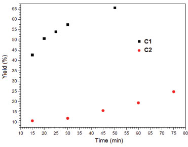 ![]() Figure 6. Yield vs. time plot for the polymerization of LLA with C1 and C2. Conditions: bulk polymerization, LLA/Zn = 1000, 180 °C