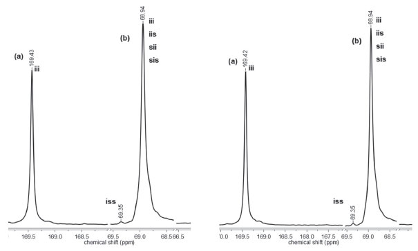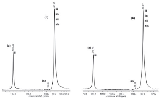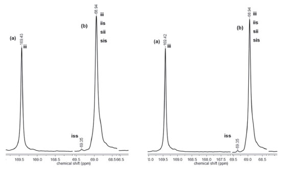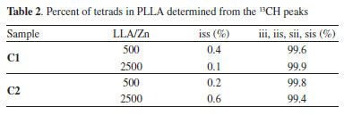 The region corresponding to the carbonyl groups shows low intensity lateral signals, which indicate the presence of very small amounts of other tetrad sequences different from iii. These results suggests that the polymers exhibit high stereoregularity. The methine region (68.97 ppm) seems to be more sensitive to the small difference in the stereoregularity of the samples, showing a split at 69.35 ppm (tetrad iss). The evaluation of stereoregularity based on NMR tetrad analysis for PLLA prepared at two LLA/Zn molar ratios (500 and 2500) is presented in Table 2. The tetrad percentage was calculated from the integration of the corresponding 13C peaks of iss and iii, iis, sii, sis tetrads.48