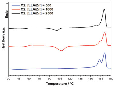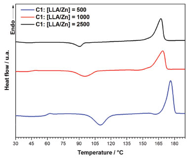 According to Table 2, all polymers have a high stereoregularity with percentage of isotactic rich tetrads (iii, iis, sii) superior to 99%. It was not possible to observe any influence of the ligand structure or LLA/Zn molar ratio on the stereoregularity of these polymers, which means that the microstructure of the polymers generated from C1 and C2 is controlled by the nature of the metal center. Polymer thermal properties DSC curves for PLLA synthesized using C1 and C2 were obtained in order to access the main transition temperatures. The values for the transition temperatures are shown in Table 3. Glass transition (Tg), crystallization temperature on heating (cold crystallization) (Tcc) and melting temperature (Tm) were obtained from a second heating run at 10 °C min-1 after a fast cooling run. Crystallization temperature on cooling (Tc) was accessed from a cooling run at 10 °C min-1. The Figures 9 and 10 show the DSC curves for the polymers obtained at different LLA/Zn molar ratios with C1 and C2, respectively.
