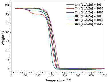 TGA data (Figure 11) show that the content of final residues obtained at 700 °C is very small (0.1 to 2.0 wt%) and increases as the LLA/Zn ratio increases. This is probably due to a decrease in the polymer yield and increase in the residual initiator/polymer ratio.