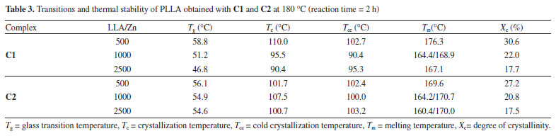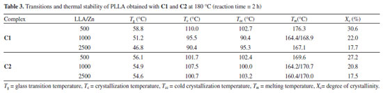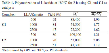 Complexes C1 and C2 are soluble in L-lactide above 100 °C and catalyze the ring-opening polymerization of this lactone to produce PLLA. Herein, we assume that they exist as mononuclear entities in solution before coordinating to L-lactide in the beginning of the catalytic cycle. Ring opening polymerization of L-Lactide Bulk polymerization of L-lactide using C1 and C2 as initiators (Figure 5) were investigated in order to gain some insight into their performance in producing poly(L-lactic acid) (PLLA). The reactions were carried out at 180 °C for 2 h using different lactide/initiator molar ratios (LLA/Zn = 500, 1000 and 2500). Both complexes show good activity. Here, we observe that the smallest LLA/Zn ratio favors the highest monomer-polymer conversion at the condition used in this work (Table 1).