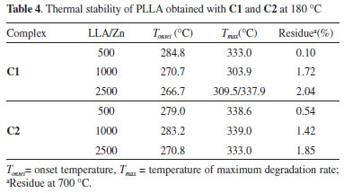 In general, the polymers show Tg in the expected range for high molecular weight PLLA (Tg = 50-60 °C) and high Tm (> 175 °C), confirming that they have high degree of stereoregularity. The PLLA obtained with C1 at LLA/Zn = 500 show the highest Tm (176.3 °C) and degree of crystallinity (Xc= 30.8%). While for PLLA prepared with C1 the increase in LLA/Zn decreases the Tm, for the PLLA prepared with C2 practically no difference was noted in the Tm when the LLA/Zn ratio is changed. It is important to pay the attention to the presence of two melting endotherms for the polymers obtained at LLA/Zn = 100 and 2500, which suggests two different types of crystals in these polymers. Table 4 summarizes the thermal stability data with the degradation temperatures (onset and maximum degradation rate) and the residue percentage at 700 °C of PLLA obtained using C1 and C2. The PLLA show a weight loss profile with only one degradation step with the onset temperature (Tonset) and temperature of maximum degradation rate (Tmax) around 270 °C and 330 °C, respectively. Tonset and Tmax obtained for these polymers are below those reported in the literature for commercial PLLA obtained with tin octoate initiator, which are about 350 °C and 370-390 °C, respectively.49 As these lower values of Tonset and Tmax are also observed for the PLLA produced at LLA/Zn = 500, with high molecular weight (Mn = 109,100 g/mol), these lower degradation temperatures do not seem to be related to molecular weight, but to the nature of metal residue. Residual zinc is likely to accelerate thermal chain degradation in these polymers.