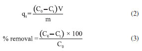 MATERIAL AND METHODS Reagents and Solutions The reagents used were nitric acid, potassium chromate, acetone, sodium hydroxide, and hydrochloric acid, all obtained from Merck. Cobalt(II) acetate tetrahydrate obtained from Dinâmica. Sodium borohydride obtained from Sigma-Aldrich. Ethanol (95%) obtained from Vetec. Sulfuric acid obtained from Synth. 1.5-Diphenylcarbazide obtained from Neon. All solutions used were prepared from ultrapure water (system Milli-Q from Direct-Q 3UV) and stored under refrigeration at 4 °C. Synthesis of Cobalt Nanoparticles (NPs-Co) The NPs-Co were synthesized by chemical reduction of the metal using sodium borohydride (equation 1), with adaptations of the methodology reported by Liang and Zhao8. Initially 8.62 g of cobalt(II) acetate tetrahydrate was added to 50.0 mL of ethanol/water (4:1, v/v) solution. The system was kept under constant stirring for 10 min. After the time interval, 100.0 mL of sodium borohydride (1.08 mol L-1) solution was added to the system at a rate of approximately 50.0 µL min-1 under constant stirring with the formation of a black precipitate. The system was allowed to stand at room temperature, and subsequently, vacuum filtration and washing of the material obtained with Milli-Q water and ethanol were performed. Finally, the material obtained was oven dried at 40 °C for approximately 2 hours and stored under refrigeration at -20 °C. ![]() Characterization of NPs-Co Morphological characterization and particle size were performed using a Transmission Electron Microscopy (Tecnai G2-12 -SpiritBiotwin FEI - 120 kV). To evaluate the structure of NPs-Co was used an X-ray diffractometer (Bruker model D8 Discover, using radiation Cu-Kα (λ = 0.1541 nm) with angular variation 2θ from 5 to 95°) and Fourier Transform Infrared Spectroscopy (FT-IR 660, Varian Inc., EUA) in the region of 400 to 4000 cm-1. To determine the pH of the point of zero charge (PZC) of nanomaterials, was added 20.0 mL of NaCl (0.050 mol L-1) in six Erlenmeyer flasks, with initial pH set to 2.0, 4.0, 6.0, 8.0, 10.0 and 12.0 using solutions of HCl or NaOH (0.10 mol L-1). Subsequently, 20.0 mg of NPs-Co were added to each Erlenmeyer flasks. The system was placed under constant orbital agitation (220 rpm, Incubator Shaker Series - New Brunswick Scientific) at 25 °C for 48 hours. After the time interval, the suspensions were centrifuged (3600 rpm) during 10 minutes and the final pH values of the supernatant were measured.15 The pH value in the PZC was calculated by the arithmetic mean of the final pH points that were constant.16 Removal of Cr(VI) by NPs-Co The removal assays were performed in Erlenmeyer flasks 125 mL, wherein 20.0 mL of Cr(VI) solution and the required dose of NPs-Co were added. The reactions were under constant agitation (220 rpm). At predetermined times (10 hours) aliquots were collected and filtered on PTFE membrane (0.45 µm and 13 mm diameter, Millipore). To quantify the remaining Cr(VI) in the solution, the colorimetric method of 1.5-diphenylcarbazide was used.17 After the reaction, an aliquot of 500.0 µL of sample, previously filtered, was transferred to a 10.0 mL volumetric flask. 20.0 µL of concentrated H2SO4 and 200.0 µL of 1.5-diphenylcarbazide (8.25x10-3 mol L-1) also were added to the flask. The volume was completed with Milli-Q water. The Molecular Absorption UV/Vis Spectrophotometry (Thermo Scientific - Model Evolution Array) in the wavelength of 542 nm was used to monitor the percentage of Cr(VI) removed. Different parameters were evaluated in Cr(VI) removal by NPs-Co as: (1) time of equilibrium, dose of the NPs-Co (0.20, 0.40, 0.60, 0.80, 1.00, 1.60 and 2.00 g L-1), initial concentration of Cr(VI) (40.0, 80.0, 100.0, 150.0, 200.0 and 300.0 mg L-1), and initial pH (2.0, 4.0, 6.0, 8.0, 10.0 and 12.0). The pH adjustment was performed with solutions of HCl (0.10 mol L-1) or NaOH (0.50 mol L-1). Kinetic studies were performed with the experimental data adjusted to kinetic models of pseudo-first-order (Lagergren)18 and pseudo-second order (Ho e McKay).19 Studies of adsorption isotherms were also performed by adjusting the experimental data to the Langmuir20,21 and Freundlich22 isotherm models. The thermodynamic study was performed using Cr(VI) concentrations at 40.0, 80.0, 100.0, 150.0, 200.0 and 300.0 mg L-1. For each of these concentrations, the tests were performed at temperatures of 15, 25, 35, 45 and 55 °C. At the end of the reactions, the samples were filtered and analyzed on the UV/Vis spectrophotometer. The ability to remove Cr(VI) by NPs-Co, in a certain time interval, qt (mg g-1), and the rate of removal were calculated through equations 2 and 3, respectively. ![]() wherein Ct is the residual concentration of Cr(VI) (mg L-1) in time t (min) and C0 is the initial concentration of Cr(VI) in the solution (mg L-1), V it is the volume (L), and m is the mass of nanoparticles (g). The Cr(III) and Cr(VI) adsorbed in the nanoparticles was investigated after the Cr(VI) removal reaction by Co-NPs. Then, the NPs were digested with concentrated HNO3. For this, after the reaction, the solution was centrifuged and the Co-NPs were deposited on the bottom of the flask. Nanoparticles recovered in the previous step made the addition of 3.0 mL water and 2.00 mL HNO3 concentrated. The mixture was heated to a temperature of about 200 °C until complete dissolution. After this procedure, the solution was transferred to a 10.00 mL flask and the volume filled with Milli-Q water. Cr(VI) was quantified by the 1.5-diphenylcarbazide method as described above, while Cr (III) was quantified by the EDTA method. For this, in 4.0 mL of the resulting solution was added 500.0 µL of EDTA solution (0.10 mol L-1), 1.0 mL of acetate buffer (0.18 mol L-1, pH 4.0), and 2.00 mL Mili-Q water. The system was heated in a water bath (80 °C) for 30 minutes and then cooled with ice. The resulting solution was analyzed by Molecular Absorption UV/Vis Spectrophotometry (λ = 543 nm