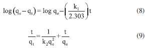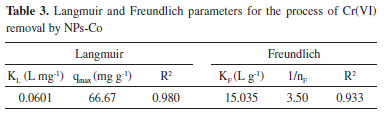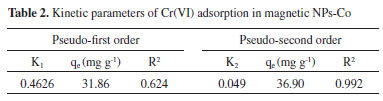 Kinetic studies of Cr(VI) removal by Co-NPs The kinetics study of removal is very important as it provides important information about the pathways and mechanism of reactions.31 The data were analyzed according to the equations of pseudo-first order (Equation 8) and pseudo-second order (Equation 9). ![]() wherein qe (mg g-1) and qt (mg g-1) are adsorption capacities of Cr(VI) at equilibrium time and at time t (hours), respectively; k1 (g mg-1 min-1) and k2 (g mg-1 min-1) are the pseudo-first order and pseudo-second order velocity constants, respectively. The kinetic parameters of Cr(VI) removal by Co-NPs can be seen in Table 2. The kinetic model of pseudo-second order was better fitted to the experimental data as can be observed by the coefficient of determination (Figure 3S in Supplementary Material). In addition, the value of the maximum adsorption capacity obtained experimentally was 36.1 mg g-1, a value very close to that found by the pseudo-second model that was equal to 36.90 mg g-1 displayed an error of 2.2%. This fact confirms the best fit of the pseudo-second model to the system studied.